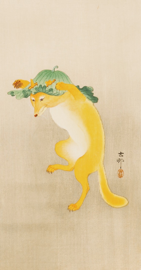 小原古邨『踊る狐』 / 狐 蓮の葉の帽子をかぶり、ユニークな雰囲気で踊っている狐の絵。可愛い見た目の一方で、その眼差しはどこか真剣さをたたえているようにも見える。新版画の画家として知られる日本の絵師、小原古邨の『踊る狐』(1904 – 1913年)。 小原古邨 1877 – 1945 日本の絵師。浮世絵を近代に復興させようという試みの新版画における画家の一人としても知られ、鳥や花、動物などの花鳥画を多く手がけた。 名画の動物園グッズ(小原古邨の狐)【PR】 Prev Next